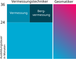 | Strukturvergleich der dualen Ausbildungsberufe Vermessungstechniker und Geomatiker (Ausbildungsordnung aus dem Jahr 2010). Die Ausbildungsdauer beider Berufe beträgt 36 Monate. Beim Vermessungstechniker erfolgt eine Binnendifferenzierung nach 24 Monate die beiden Fachrichtungen Vermessung bzw. Bergvermessung. Geomatiker und Vermessungstechniker haben darüber hinaus gemeinsame Ausbildungsinhalte, welche durch die blaue Schattierung dargestellt ist. | Eigenes Werk , vectorized version of File:Vermessungstechniker.jpg | jpg by User:Assenmacher , vectorized by HerrAdams | Datei:Vermessungstechniker, Geomatiker, Ausbildungsdauer.svg | |
