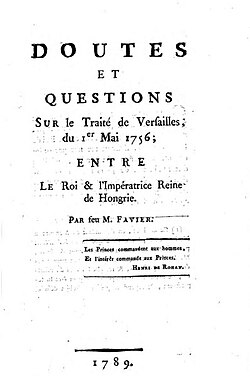 - ↑ Jörg Ulbert: Die Wirkungsgeschichte der „Diplomatischen Revolution“. Die Beurteilung des renversement des alliances und des Bündnisses mit Österreich in der französischen Öffentlichkeit und Politik, in: Sven Externbrink (Hrsg.): Der Siebenjährige Krieg (1756–1763). Ein europäischer Weltkrieg im Zeitalter der Aufklärung, Berlin 2011, S. 159–179, hier 174, 178. Zu Favier: ebd., S. 164, 171. Denkschrift in der Ausgabe von 1778, im Revolutionsjahr 1789 erfolgte eine Neuauflage: mdz-nbn-resolving.de (Digitalisat der bayerischen Staatsbibliothek).