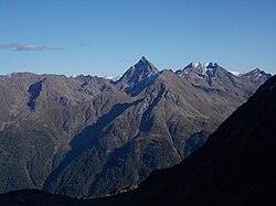 | Vesulspitze von Nordwesten beim Abstieg vom Schneidjöchl, rechts dahinter der doppelgipflige Bürkelkopf und die Flimspitze. Im Hintergrund die Ötztaler Alpen (Weißseespitze, Langtauferer Spitze, Weißkugel) | Eigenes Werk | 32 Fuß-Freak | Datei:Vesulspitze von Nordwesten beim Abstieg vom Schneidjöchl.jpg |