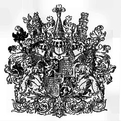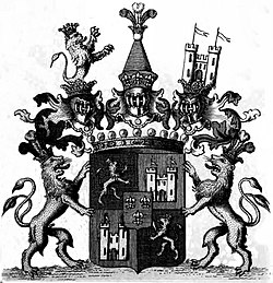 1653: Das Familienwappen ist von Schwarz und rot geviertet mit blauem Herzschild, in diesem drei (II. und I.) silberne Lilien. I. und IV. ein gekrönter, goldener, gegen die Teilung gekehrter Löwe. II. und III. eine silberne Burg mit zwei spitzbedachten Türmen, doppelter Zinnenmauer, geschlossenem schwarzen Tor, in jedem Turm zwei Fenster, in der äußeren Mauer beiderseits vom Tor fünf (III., II.) Schusslöcher. Über der Grafenkrone drei Helme, davon I. und III. gekrönt. I.: Der Löwe auf der Krone, die Decken schwarz-golden. II.: Blaue hohe Mütze mit gleichen Stulp, auf diesem nebeneinander drei silberne Lilien, auf der Spitze der Mütze eine goldene Kugel auf derselben ein goldenes, mit drei blau-golden-blauen Straußenfedern bestecktes Krönlein. Decken sind blau-silbern. III.: Die Burg auf der Krone. Die Decken sind rot-silbern. Zum vollständigen Wappen gehören noch zwei gekrönte, goldene Löwen als Schildhalter. Die Krone des Löwen zu rechts bestecken drei schwarz-golden-schwarze, die des zu links, drei rot-golden-rote Straußenfedern.