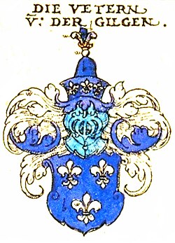 Nach Paul von Stetten stammten die mittelalterlichen, wappenverwandten Vetter von der Gilgen wie die mit ihnen stammesverwandten Vetter von dem Panthertier aus Donauwörth und gehörten daraufhin als Geschlechter dem spätmittelalterlichen Patriziat der Reichsstadt Augsburg an. Zur Zeit des Beginnens der Reformation waren einzelne Linien schon in den bayerischen Landadel übergegangen, während sie in Augsburg ausstarben.[3] 1579 war Adam Vetter von der Gilgen unter anderem Statthalter des Hochstifts Regensburg und herzoglich bayerischer Rat zu München wie auch Hofratspräsident, sowie Herr auf Oberköllnbach.[4][5] Im Jahr 1596 soll Adam Vetter von der Gilgen als der Letzte dieses Namens gestorben sein.[6]