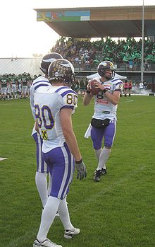 | Austrian Football League Grunddurchgangsmatch @ Danube Dragons vs. Raiffeisen Vikings Vienna , Korneuburg , Rattenfängerstadion #8 QB Christoph Gross | Eigenes Werk | Rosso Robot | Datei:2010-06-12 dra-vik christoph gross.jpg | |