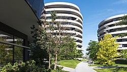 Unmittelbar an der U-Bahn-Station Krieau findet sich das höchste Gebäude des Viertels, das Bürohochhaus Hoch Zwei der Architekten Henke und Schreieck. Es ist 80 Meter hoch, hat 23 Stockwerke und 21.700 m² vermietbare Fläche; es fungiert als Zentrale der OMV. Östlich daran schließen die Bürogebäude „Plus Zwei“ und „Biz Zwei“ an (Architekt: Martin Kohlbauer), sowie „Stella Zwei“ (Zechner & Zechner). Südlich davon liegen die vier Gebäude „Rund Vier“ (Henke und Schreieck). Im Westen, an der Trabrennstraße, befindet sich das „Hotel Zwei“ mit 251 Zimmern (Zechner & Zechner). Die Namenszusätze „Zwei“ beziehen sich auf den 2. Bezirk.