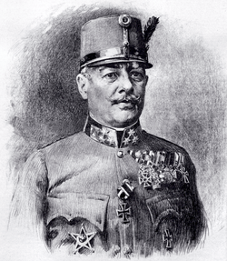 Mit Ausbruch des Krieges übernahm er am 13. September 1914 das Kommando des VIII. Korps in Prag, das in Serbien kämpfte – hierbei machte er sich besonders um die allerdings nur kurzzeitige Einnahme Belgrads verdient. Später war er in Albanien und 1916 an der Alpenfront gegen Italien in der Schlacht von Asiago eingesetzt.[5] Er wurde daraufhin zum Wirklichen Geheimen Rat ernannt.