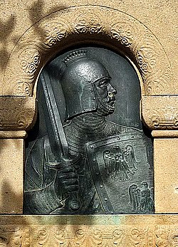 | Reinhard August zu Leiningen- Westerburg-Altleiningen (1863–1929), als Kreuzritter auf dem Röhrbrunnen Grünstadt | File:Fussgaengerzone_Gruenstadt_08.JPG | Immanuel Giel | Datei:Reinhard August zu Leiningen.jpg |