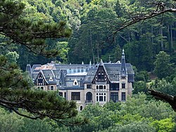 | Blick von der Burgruine Rauheneck auf die Villa Eugen in der niederösterreichischen Stadtgemeinde Baden . Die Villa wurde als Jagdschloss im Auftrag von Erzherzog Wilhelm von Österreich nach Plänen des Architekten Franz von Neumann von 1884 bis 1886 errichtet. Benannt ist sie nach Erzherzog Eugen von Österreich-Teschen , der die Villa 1894 erbte. | Eigenes Werk | C.Stadler/Bwag | Datei:Baden - Villa Eugen.JPG | |