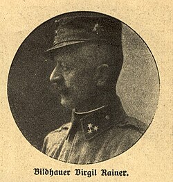 | Bildhauer Virgil Rainer | Die Woche, Jg. 1919/Heft 22, Seite 561 | Der Urheber ist unbekannt (Es findet sich weder unter dem Foto, noch im Text, noch an anderer Stelle der Zeitschrift ein Hinweis auf den Hersteller des Lichtbildes. Der dazugehörige Beitrag mit dem Titel "Tiroler Kunst" wurde von J.E. Langhans, Innsbruck, verfasst. Neben der Überschrift findet sich noch der Hinweis: "Hierzu 21 Abbildungen", wobei unter einigen Fotos die Fotografen angegeben sind, bei anderen nicht. | Datei:Virgil Rainer.jpg |
