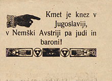 | Nalepka ob plebiscitu Kmet je knez v Jugoslaviji, v Nemški Avstriji pa judi in baroni! | Diese Datei stammt aus der Digitalen Bibliothek Sloweniens unter der Kennzahl RRX2BRH7 Bitte beachten : Dies ist keine Lizenzvorlage . Es wird eine zusätzliche gültige Lizenz benötigt. | Autor/-in unbekannt Unknown author | Datei:Nalepka ob plebiscitu Kmet je knez v Jugoslaviji 1920.jpg | |