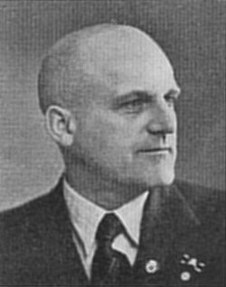 - Im Juli 1937 etablierte die vorgesetzte VoMi[86] Jens Möller von der 1935 gegründeten „Nationalsozialistischen Deutschen Arbeiterpartei Nordschleswig“ (NSDAP-N) zum Hauptansprechpartner des Reiches für die dortige Volkstumsarbeit.[87] Ab 1938 trat Jens Möller mit Unterstützung Berlins als unbestrittener „Volksgruppenführer“ hervor.[88] Möller erhoffte sich eine Grenzrevision mit dem Ziel einer Wiedervereinigung von Nordschleswig mit Schleswig-Holstein,[89] jedoch legten die reichsdeutschen Behörden seiner Manövrierfreiheit sehr enge Grenzen auf.[90] Im Dezember 1940 wurde Jens Möller in Berlin angewiesen „das Deutschtum in der Heimat zu befestigen“, wonach die „Volksgruppenführung“ ihr Hauptaugenmerk auf eine Stärkung der politischen Organisation und des kulturellen Lebens der Volksgruppe setzte.[91] 1943 richtete das dänische Staatsministerium ein behördliches Büro für die deutsche Volksgruppe ein.[86]