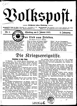 | old austrian newspaper | http://anno.onb.ac.at/cgi-content/anno?aid=vol&datum=19150102&seite=1&zoom=33 | Unbekannt Unknown autor | Datei:Volkspost111.jpg |
