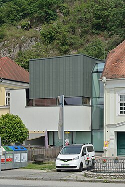 | Die Volksschule in Marbach an der Donau ist das Erstlingswerk von Clemens Holzmeister. 2014 wurde westlich ein moderner Erweiterunsbau angestellt. Der neue Gebäudeteil beherbergt auch die Musikschule Nibelungengau. | Eigenes Werk | Herzi Pinki | Datei:Volksschule Marbach an der Donau 05.jpg |