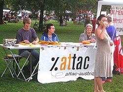 | An ATTAC stall at the Volksstimmefest , Vienna , Austria , September 4, 2005. The Volksstimmefest is an annual two-day event organized by the Communist Party of Austria at the Jesuitenwiese, Prater, Leopoldstadt . It takes place on the first weekend in September. | Copied from en:Image:%attac.JPG | Photo by KF | Datei:%attac.JPG | |