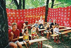 | Kids and their parents watching a Punch and Judy show at the Volksstimmefest , organized by the Austrian Communist Party (KPÃ) and held annually at the Prater on the first weekend in September. Volksstimme is the German word for voice of the people ( vox populi ). See also fest . Photo by KF , September 2002. | Übertragen aus en.wikipedia nach Commons durch Papa November mithilfe des CommonsHelper . | KF in der Wikipedia auf Englisch | Datei:Volksstimmefest 2002 3.jpg |