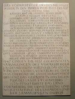 | Vorarlberger Landesmuseum, Bregenz Tafel zur Geschichte des Museums im Eingangsbereich | Selbst fotografiert | Photo: Andreas Praefcke | Datei:Vorarlberger Landesmuseum 2009 Tafel.jpg |