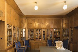 | Vorwärts-Haus. Detail des Sitzungssaales, heute Austerlitz Zimmer genannt. Im zweiten Bücherschrank der Wand befindet sich eine Geheimtür. | Eigenes Werk | Thomas Ledl | Datei:Vorwärtshaus Innenansicht 3.jpg | |