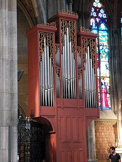 Die alte Chororgel befindet sich im Kapellenkranz rechts vorne hinter dem Chorgitter und wurde 1904 von Franz Capek[Anm. 1] (1857–1938) gefertigt. Ursprünglich hatte die Orgel ein zweimanualiges pneumatisches Werk. 1949 erfolgte ein Umbau auf zehn Register auf einem Manual und Pedal, Schleifladen und mechanische Traktur. Das Gehäuse stellt kunsthistorisch einen besonderen Wert dar.[15]