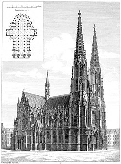 Votivkirche in Wien (IX.); Architekt: Heinrich Freiherr von Ferstel | Wilhelm Lübke, Carl von Lützow (Hrsg.): Denkmäler der Kunst zur Übersicht ihres Entwicklungsganges von den ersten Versuchen bis zu den Standpunkten der Gegenwart. Zweiter Band. Dritte verbesserte und vermehrte Auflage. Ebner & Seubert, Stuttgart 1879, S. 137: Architektur Taf. LVIII. Wiener Bauwerke | Autor/-in unbekannt Unknown author | Datei:Votivkirche Wien-Ferstel-187x.jpg | |