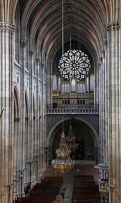 Die Orgel wurde 1878 von der Orgelbauanstalt E. F. Walcker (Ludwigsburg) erbaut, nachdem sämtliche Orgelbaufirmen in der österreichischen Monarchie außerstande waren, den Auftrag auszuführen.[14] 1915 wurde eine elektrische Windanlage installiert. Die Prospektpfeifen fielen der Rüstungsindustrie des Ersten Weltkriegs zum Opfer und wurden 1923 durch Zinkpfeifen ersetzt.