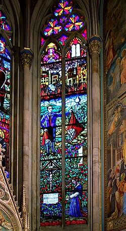 Im Zweiten Weltkrieg wurden die Glasfenster der Votivkirche zerstört und anschließend provisorisch verglast. Bei der Kirchenrestaurierung von 1960 bis 1973 erfolgte großteils eine Neugestaltung der Glasfenster,[10] denn bis auf die große Rose an der Hauptfassade und das Kaiser-Fenster von Eduard von Steinle an der rechten Stirnseite des Querhauses fehlten die Originalzeichnungen, so dass sie in ihrer ursprünglichen Form nicht mehr rekonstruiert werden konnten.[11] Im Zuge dieser Neugestaltung wurde 1972/1973 auch ein Glasfenster mit dem Thema Widerstand und Franz Jägerstätter eingesetzt, das mittels eines Teils der Erbschaftsmasse der Kammersängerin Mária Németh finanziert wurde.[12] Dies war das erste Sakralkunstwerk, das das Martyrium des oberösterreichischen Kriegsdienstverweigerers aufgegriffen hat. Es befindet sich in der Kreuzkapelle, auch als Werktags- und ehemals als Kaiserkapelle bezeichnet.[10]