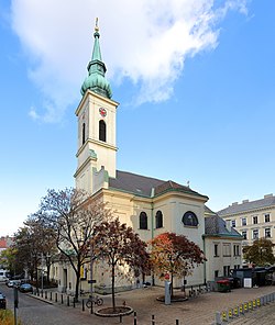 | Südwestansicht der röm.-kath. Pfarrkirche hl. Gertrud im 18. Wiener Gemeindebezirk Währing . Die Kirche wurde ab 1753 anstelle einer einsturzgefährdenden Kirche neu errichtet. 1858 ersetzte man den alten Kirchturm durch einen westseitigen Fassadenturm. 1885 erfolgte der Bau eines Portalvorbaues an der Westseite. 1934 wurde nordseitig ein großer multifunktionaler Kirchenraum mit rechteckigem Grundriss an die barocke Kirche angebaut. | Eigenes Werk | C.Stadler/Bwag | Datei:Währing - Kirche St. Gertrud.JPG |
