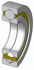 | Vierpunktlager, Blechkäfig aus Messing, beidseitigen Deckscheiben, 120°Schnitt, Hinweis: Innenaufbau des Lagers (insbesondere des Kaefigs) variiert je nach Hersteller und Baugroesse rolling contact bearings | created by Silberwolf | Silberwolf | Datei:Angular-contact-ball-bearing single-row din628 type-b 120.png | |