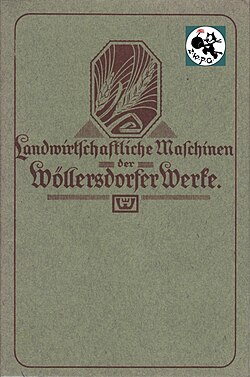 | Deckblatt des Produktkataloges der Wöllersdorfer Werke, landwirtschaftliche Maschinenfabrik, ca. 1920 | Eigenes Werk | Schlot at | Datei:Produktkatalog, ca. 1920.jpg | |