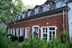 | Ehemaliger Herzoglich-Württembergischer Reitstall, eingeschossiger Mansardwalmdachbau, Sichtziegelmauerwerk mit Hausteingliederungen, bez. 1890, von Christian Zinstag, für Wohnnutzung teilweise erneuert Dieses Bild zeigt ein Baudenkmal. Es ist Teil der Denkmalliste von Bayern, Nr. D-3-62-000-1581. | Eigenes Werk | Johanning | Datei:Hundsumkehr 5 ehem. Reitstall Regensburg 2014.JPG | |