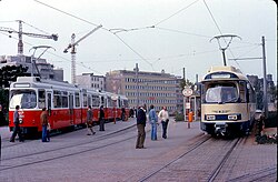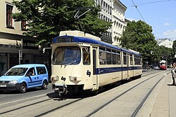 | Lokalbahnzug nach Baden an der Haltestelle Johann-Strauß-Gasse, der letzten vor dem Ustrab-Tunnel unter dem Wiedner und Margarethengürtel. Der Anstrich dieses Wagens wurde an den der Niederflurwagen der Reihe 400 angepasst. Die Ziffer 4 vor der Wagennummer kennzeichnet die Wagen, bei denen die Vielfachsteuerung an die der Reihe 400 angepasst wurde. | Eigenes Werk | Falk2 | Datei:I09 513 Wiedener Hauptstraße, ET 112 WLB.jpg | |