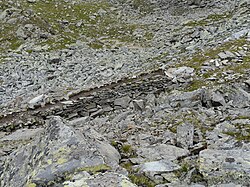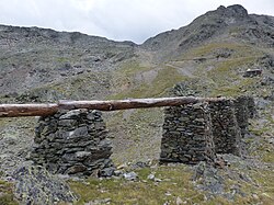 Reste des inzwischen verrohrten Goldrainer Jochwaals im oberen Penaudtal in der Nähe vom Niederjöchl (2662 m), über welches das Wasser in den Vinschgau geleitet wird. Eigenes Werk Whgler