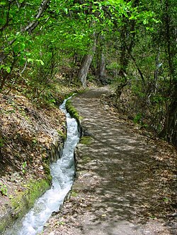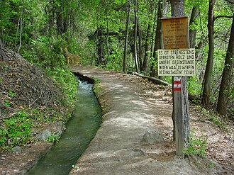 • Meran: Maiser Waal (auch: Neuwaal Obermais), ungefähr 9 km[9] lang. Er führt von Saltaus, wo das Wasser von der Passer abgeleitet wird, in Richtung Meran durch die Gemeinden St. Leonhard, Riffian, Schenna, Meran und endet im Stadtteil Obermais. Der bereits seit dem 13. Jahrhundert urkundlich bezeugte Name des Waales leitet sich von der ehemals selbständigen Gemeinde Mais ab, die heute die beiden Stadtteile Obermais und Untermais umfasst. Der Neuwaal wurde im Jahr 1658 nach längerem Verfall wiedereröffnet, dient bis heute der Bewässerung landwirtschaftlicher Nutzflächen und wird seit dem Jahr 2012 im Rahmen eines aufwändigen Projektes saniert. Das Bodenverbesserungskonsortium Neuwaal Obermais mit Sitz in Meran hält den Wasserlauf samt parallel laufendem Wanderweg in Stand.