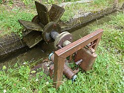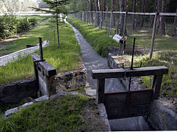 Ein Waal in Laatsch (Vinschgau), mit einem Brett als Wehr zum Umleiten des Wassers