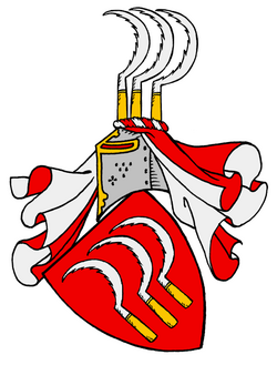 Blasonierung: Das Stammwappen zeigt den Schild in Rot mit drei nebeneinander stehenden rechtsgekehrten silbernen Sicheln mit goldenen Stielen; auf dem Helm mit rot-silbernen Decken die drei Sicheln.