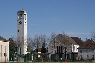 Die Pfarrkirche heiliger Michael wurde in den Jahren 1937 bis 1938 nach den Plänen von Rudolf Wondracek errichtet und im Jahr der Fertigstellung von Michael Memelauer eingeweiht.[7] Der schlichte Bau mit kreuzförmigem Grundriss wurde durch einen Laubengang sowohl mit dem freistehenden Glockenturm als auch mit dem Pfarrhof verbunden.[6] Am 7. Juni 2009 bekam die Pfarre, anlässlich des 70-jährigen Kirchenjubiläums, ihre von Spendengeldern finanzierte fünfte Glocke.[8] Die Jubiläumskapelle in der Purkersdorferstraße wurde 1908 errichtet und 1994 komplett saniert.