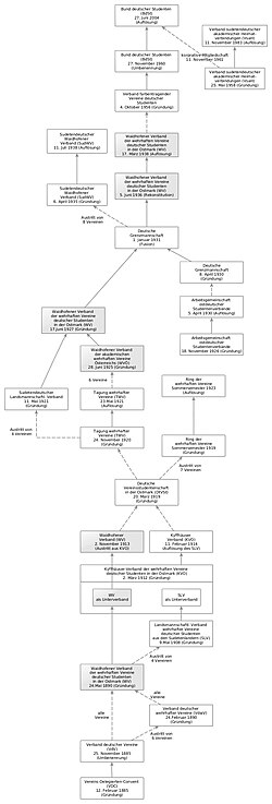 Im ideologischen Umfeld Georg von Schönerers gründete sich 1885 der Vereins-Delegierten-Convent als Zusammenschluss von Wiener Studentenvereinen.[A 1] In den Folgejahren traten weitere Vereine bei, spalteten sich in einen eigenen Verband ab und schlossen sich schließlich am 24. Mai 1890 in Waidhofen an der Ybbs im Waidhofener Verband der wehrhaften Vereine deutscher Studenten in der Ostmark zusammen.[2] Im März 1896 führte der WV das Waidhofener Prinzip ein, an dessen Formulierung verschiedene Mitgliedsvereine des WV maßgeblich beteiligt waren. Als Reaktion wurde im Mai 1896 der Verband durch die staatlichen Behörden aufgelöst.[3] Im Jahr 1912 wurde der WV mit dem Landsmannschaftlichen Verband wehrhafter Vereine deutscher Studenten aus den Sudetenländern zusammengeführt, trennte sich 1913 wieder, um sich 1919 erneut zusammenzuschließen, diesmal unter dem Namen Deutsche Vereinsstudentenschaft in der Ostmark.