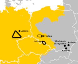 Die Erwähnungen der Ortschaften der zweiten Sprachinsel um Krosno und Iwonicz stammen aus den Jahren 1388 (Haczów) bis 1437.[19][A 1] Die Städte wurden am schnellsten assimiliert, aber in beiden Gebieten hielt sich deutschsprachige Bevölkerung in einzelnen Dörfern bis ins 17. Jahrhundert (Haczów bei Krosno und Markowa, Albigowa und Kraczkowa bei Łańcut). Ursprünglich bezeichnete der polnische Begriff Głuszy Niemcy nur die deutschsprachigen Bewohner dieser beiden Sprachinseln.