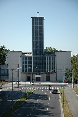 | Linz-Bindermichl, Pfarrkirche St. Michael (erbaut 1954-57 nach Plänen von Fritz Reischl). Ostfassade von der Muldenstraße aus gesehen. | Eigenes Werk | Otto Normalverbraucher | Datei:Pfarrkirche Bindermichl.JPG | |