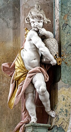Große Putten ergänzen das Rahmenwerk. Der Putto des Benediktaltars hält ein aufgeschlagenes Buch mit den Lettern „AUSCULTA O FILI“ (Höre, mein Sohn), den Anfangsworten der Regel des Hl. Benedikt. Der Putto des Bernhardsaltars ist ungleich berühmter: Als »Honigschlecker« ist er in zahlreichen Formen als Kitschfigur zu kaufen. Der Putto hält einen Bienenkorb im Arm, der im Gemälde selbst noch einmal dargestellt ist. Er spielt auf einen metaphorischen Beinamen des heiligen Bernhard an, der wegen seiner Predigten Doctor mellifluus („honigfließender Lehrer“) genannt wurde. Kunstgeschichtlich hat diese Figur keine herausgehobene Bedeutung; durch ihre Vermarktung hat sie jedoch in gewissem Sinne der Marienstatue den Rang als Kultbild abgelaufen.