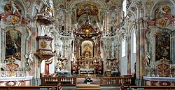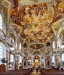 Die künstlerische Ausgestaltung des Innenraums im ornamentalen Stil des Rokoko hat auf den heutigen Betrachter eine mitreißende Wirkung. Die Überwältigung ist ein geplanter Effekt: die Pracht der Kirche soll den Gläubigen von der Größe Gottes überzeugen. Der Himmel und das Jenseits werden buchstäblich auf die Erde geholt, so dass der Gläubige sie nicht nur ahnen kann, sondern plastisch vor sich sieht. Die katholische Gegenreformation versuchte so, vor allem in der Baukunst der Jesuiten, mit rhetorischen Mitteln die Gläubigen zum rechten Glauben zurückzubringen. Abt Anselm II. betonte in seiner Kirchweihpredigt, dass nicht das Kloster, sondern Maria selbst die Kirche erbaut habe. Andererseits konnte sich das Kloster dank der aufwendigen Marienverehrung in den Bildwerken ihres Beistands gewiss sein.
