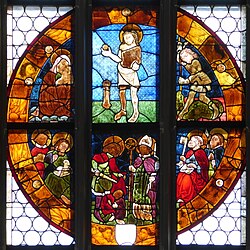 | Pfarrkirche hl. Andreas, Heiligenblut 16, Raxendorf, Niederösterreich - Glasfenster (15. Jh.) oben: Schmerzensmann mit Hostie zwischen Madonna mit Kind und hl. Georg; unten: hll. Stephanus und Johannes d.T., Martin und Erasmus, Petrus und Paulus(?); im Rahmenband Engel mit Hostien | Eigenes Werk | BSonne | Datei:Heiligenblut Kirche03.jpg | |