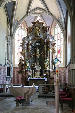 Der Hochaltar aus der Zeit um das Jahr 1730 hat einen Skulpturenaufbau aus marmoriertem Holz mit einer Rundbogennische, die von Säulen flankiert ist. Der Altarauszug wird von einem bewegten Gebälk getragen. In der von Maria und Johannes flankierten Mittelnische sind Christus am Kreuz, die kniende heilige Maria Magdalena und zwei Engel dargestellt. Der linke Engel fängt in einem Kelch das Blut aus der Seitenwunde auf. Seitlich befinden sich Statuen der Heiligen Petrus und Paulus auf Volutensockeln und im Auszug eine Statue des heiligen Andreas.