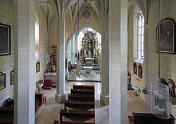 Das Langhaus aus dem vierten Viertel des 15. Jahrhunderts hat drei vierjochige Schiffe. Es wurde ursprünglich als zweischiffige Halle geplant und begonnen. Die gleich breiten ehemals mit „1494“ bezeichneten[6] steilen Gewölbe ruhen auf schlanken sechsseitigen Pfeilern über Sockeln. Das Mittelschiff hat ein zweizeiliges Netzrippengewölbe, in den Seitenschiffen befinden sich Kreuzrippengewölbe, welche von hochsitzenden polygonalen Konsolen anlaufen.