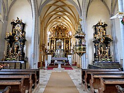 Ein überlebensgroßer spätgotischer Kruzifixus aus der Zeit um 1510 hat neugotische Assistenzfiguren aus dem späten 19. Jahrhundert. Die Engel an den Langhauspfeilern schuf wahrscheinlich Johann Nischlwitzer im dritten Viertel des 18. Jahrhunderts.