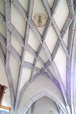 Der Fronbogen zwischen Chor zum Langhaus ist kaum ausgeprägt. Die dreischiffige dreieinhalbjochige Hallenkirche hat ein Mittelschiff in der Breite des Chors sowie schmale Seitenschiffe und durchgehend Netzrippengewölbe mit Ziegelrippen auf vier Achteckpfeilern mit vier aufgelegten Runddiensten. Im westlichen Halbjoch befindet sich eine Empore in allen drei Schiffen auf einem engmaschigen Netzrippengewölbe, im Mittelschiff mit durchbrochener Vierpassbrüstung. Die Seitenschiffbrüstungen haben eine barocke Felderteilung. Das kielbogige Sakristeiportal und das rechteckige Emporenportal haben Eisentüren.