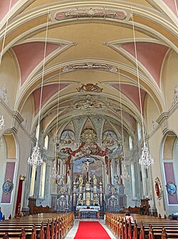 Das Langhaus ist sechsjochig, rund 45 m lang und an der breitesten Stelle 40,5 m (Kapellenachse) breit. Es nimmt die Breite der drei mittleren Fassadenachsen ein. Im ersten Langhausjoch befinden sich zwischen Fassade und Türmen Kapellen. Der saalartige, 17 m hohe Innenraum trägt ein Flachtonnengewölbe mit Stichkappen. Der Abschluss des Chores ist flach mit abgerundeten Ecken. Ansonsten ist der Chor nur durch seine Ausmalung vom Langhaus abgehoben. Dahinter befindet sich die Sakristei. Zwischen dem vierten und fünften Langhausjoch befindet sich auf beiden Seiten je ein Kapellenanbau. Die Verbindung zum Langhaus erfolgt durch halbrunde Bogenöffnungen, die Kapellen sind einjochig mit Kreuzgratgewölbe und haben eine Apsis mit je zwei Stichkappen.