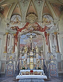 Die Abschlusswand des Chores ist mit illusionistischer Malerei aus dem Jahre 1793 versehen. Die Malerei umrahmt dabei die vor ihr aufgestellte Kreuzigungsgruppe. Es ist eine gemalte Säulenarchitektur mit den beiden Propheten Jeremias und Isaias. Zwischen ihnen öffnet sich die Landschaft von Jerusalem. Über allem schweben Gottvater und der Heilige Geist. In einer Lunette befindet sich das Wappen des Fürstbischofs Franz Caspar von Stadion. Die zur Sakristei führenden Wände des Chores tragen folgende Bilder: Dankopfer des Noah, der Verkauf Josefs durch seine Brüder, die Eherne Schlange und das Opfer Abrahams. Diese Bilder gehören typologisch zur Kreuzigung. An der Decke befinden sich Bilder der vier Evangelisten.