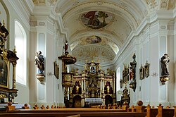 Die Kirche ist ein einziger Baukörper mit einem barocken, von Johann Lanit aus Wels gebauten Hochaltar aus dem Jahr 1790. Der Altar enthält die Gnadenstatue Maria Schutz sowie weitere Heiligenfiguren. Die barocken Wandmalereien von Andreas Kitzberger aus 1792 zeigen Szenen aus dem Leben Marias. Die Rokoko-Kanzel stammt von Simon Mayrhofer aus Oberneukirchen und wurde 1791 gebaut. Die Glasfenster aus dem Jahr 1906 stammen von Penner und Schürer. Die neobarocken Seitenaltäre wurden 1893 von Josef Kepplinger gebaut und zeigen Maria mit ihren Eltern.