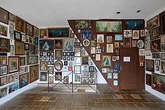 Stiegenhaus mit Heiligenbilder im linken Kirchturm