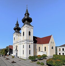 | Südansicht der Pfarr- und Wallfahrtskirche in der niederösterreichischen Marktgemeinde Maria Taferl mit den Pfarrhof (links), der Volksschule (rechts) und dem Kriegerdenkmal (links im Vordergrund). Die Wallfahrtskirche wurde ab 1660 errichtet und 1724 geweiht. Ab 2004 fand eine Generalsanierung in Etappen statt, die im Herbst 2018 abgeschlossen wurde. | Eigenes Werk | C.Stadler/Bwag | Datei:Maria Taferl - Kirche (0).JPG | |