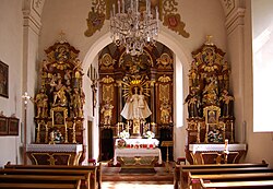 | Die Wahlfahrtskirche Maria Trost in Berg bei Rohrbach (Bezirk Rohrbach, Oberösterreich) geht vermutlich auf eine Kapelle der mittelalterlichen Burganlage zurück. Der heutige, dreijochige Saalbau entstand im gotischen Stil, erfuhr jedoch 1645/55 einen Umbau und wurde barockisiert. Der Hochaltar mit einem frühbarocken Gnadenbild der Maria mit Kind (1656) stammt aus der Mitte des 18. Jahrhunderts, die Seitenaltäre mit Darstellungen von Heiligen aus der Zeit um 1740. Dieses Bild zeigt das in Österreich unter der Nummer 13967 denkmalgeschützte Objekt. ( Commons , de , Wikidata ) | Eigenes Werk | Michael Kranewitter | Datei:Wallfahrtskirche Maria-Trost Altäre.jpg | |