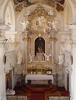Das um 1500 entstandene Gnadenbild thront über dem Altar und ist in eine Nische integriert, die zur 13. Station des Kreuzweges ausgestaltet ist. Diese Nische ist flankiert von den Assistenzfiguren der heiligen Katharina von Alexandrien und der heiligen Barbara. Die Einbindung des Hochaltares, der von Josef Staff stammen dürfte, in den Zyklus des Kreuzweges ist nicht ohne Vorbild, aber doch eine Rarität. Die Deckengemälde stammen von Matthäus Günther, der auch in der Wiltener Pfarrkirche gearbeitet hat.